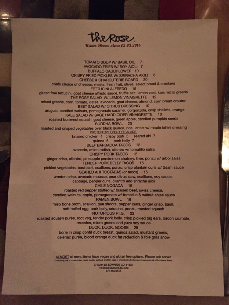Introducing The Rose, a vibrant addition to Edwards, CO, specializing in New American cuisine. Nestled at 97 Main St, this culinary gem offers a delightful blend of flavors, perfect for locals and visitors alike. The menu brims with tantalizing starters like KFC Wings with koji serrano sauce and Avocado Fries paired with soy aioli. And for those seeking a fresh crunch, the Rose Salad and Beet Salad showcase local produce and vibrant ingredients.